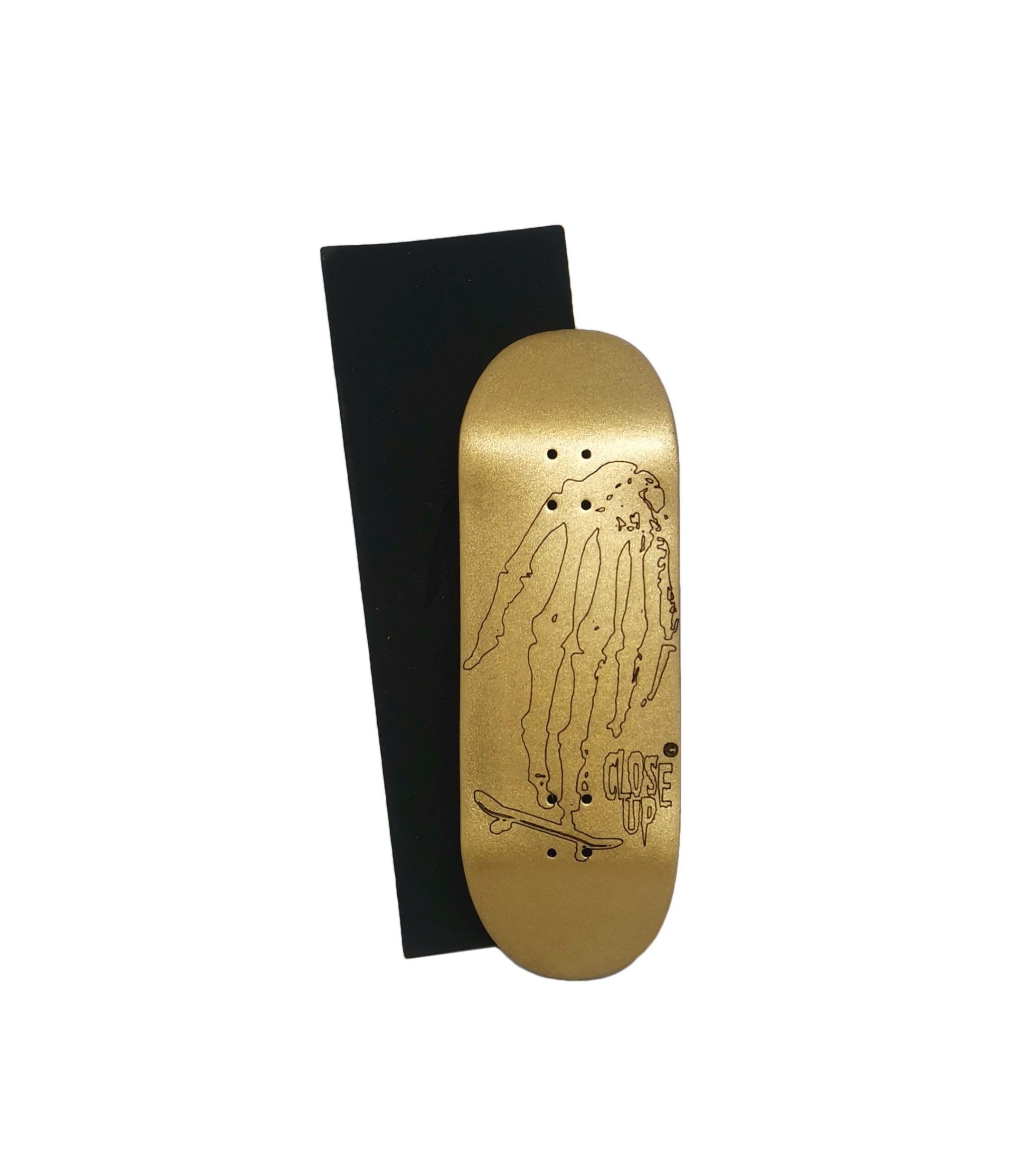 This 34mm x 98mm FB deck has a medium concave, a full golden painted background with our famous Close Up Skull Hand logo, printed by laser. It is delivered with a printed rectangle riptape to position and cut the way you like.