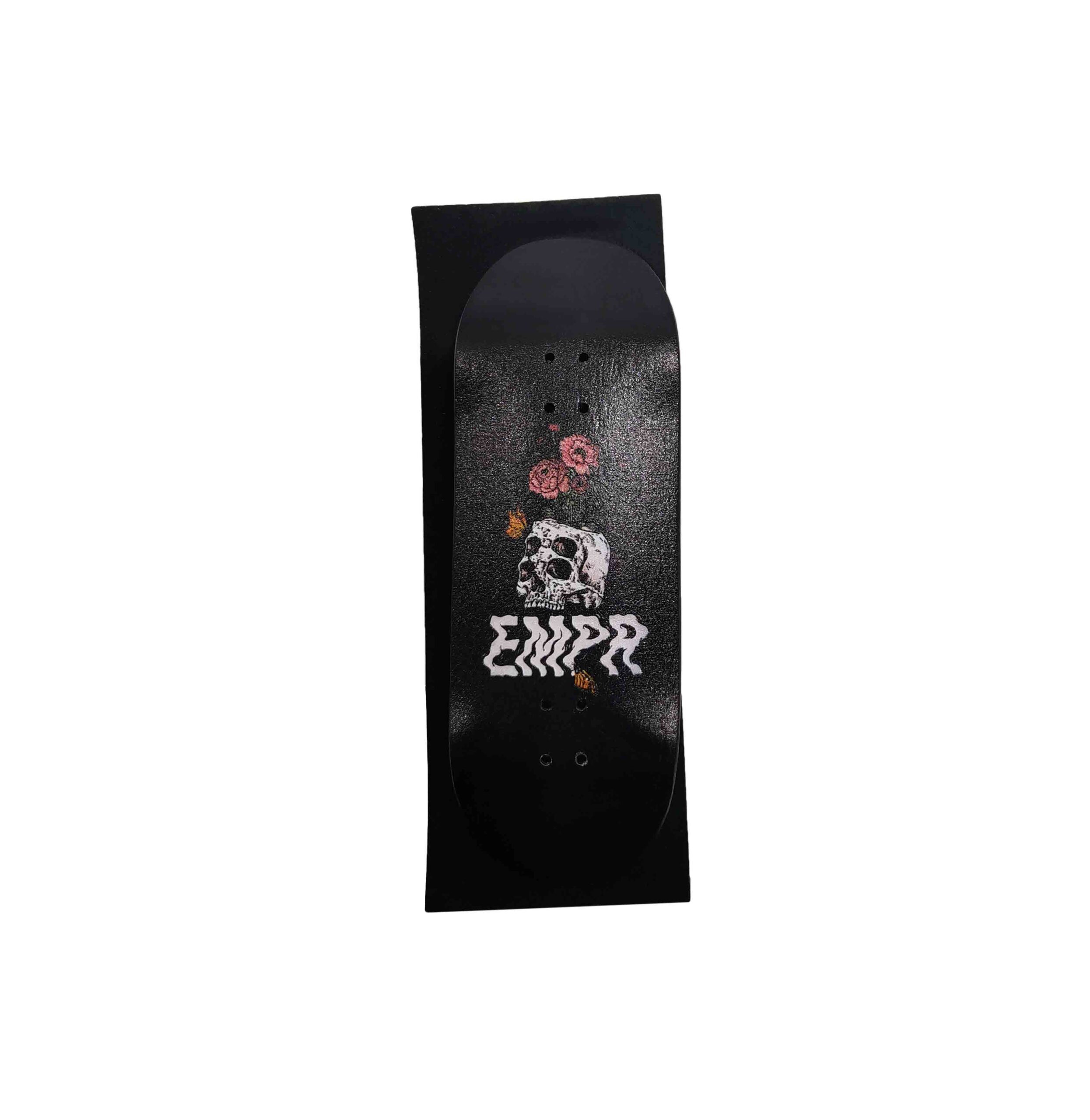 This fb deck is the minniature copy of the last Empire boardshop graphic (Pau, France), suggesting a Skull head with roses on black background! 34mm wide x 98 mm lenght on a medium concave shape, it is delivered with a rectangle quality rip tape, to position and cut, as on a real skateboard deck. You can also use real skateboard grip tape!