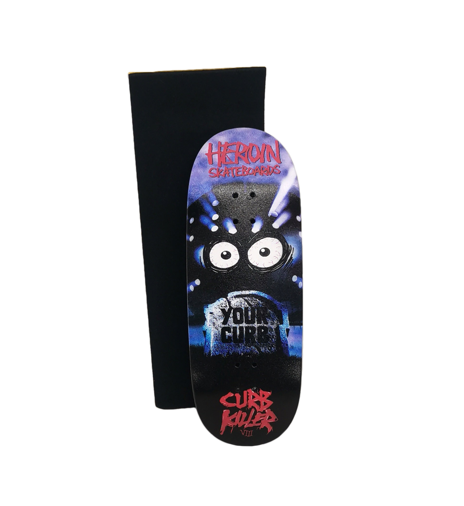 This new Heroin graphic is the Curb Killer VIII version, “Your curb” created by FOS, Heroin Skateboards manager and artist! We managed to respect the real skate deck shape on a 35mm wide deck, 5 maple plys and a medium concave. It is delivered with its essential rip tape, but you can of course position and cut some real skateboard grip tape!
