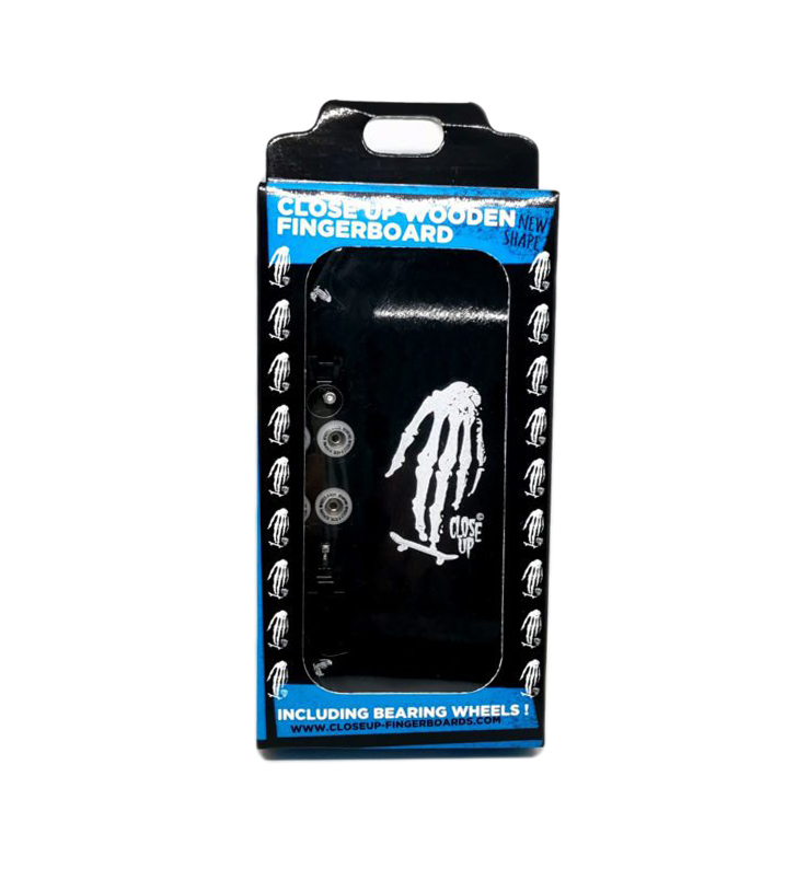 This complete wooden fingerboard set up includes a real maple plies 34 mm wide fb deck, medium concave, with our famous Close Up white Skull Hand logo on black background, CNC quality bearing printed wheels, new printed black trucks 32mm wide, tool and locking nuts, screws, bushings, washers necessary to assemble it your own. A rectangle rip tape to cut your own is also included under the deck + Close Up stickers