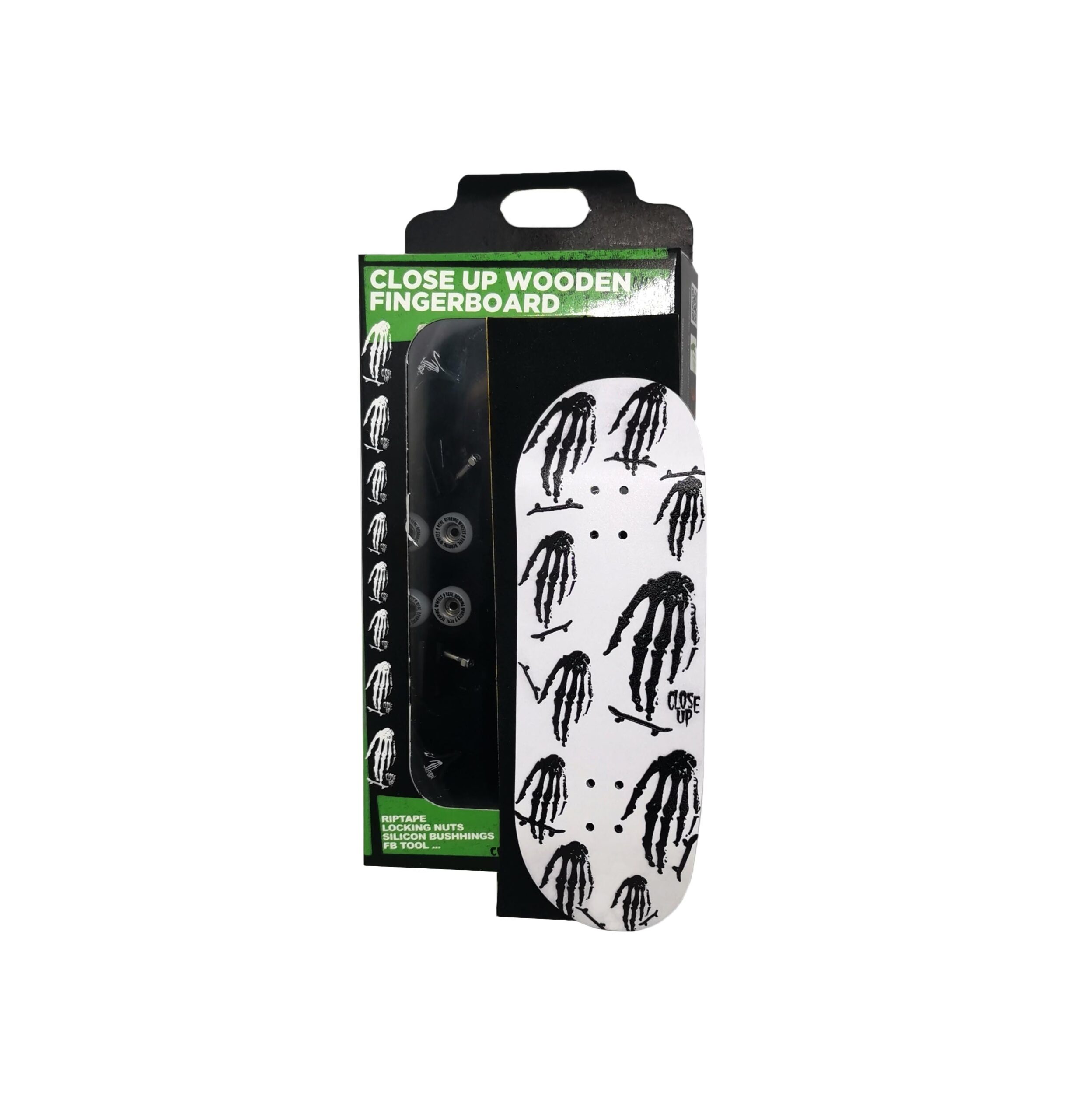 This complete set includes a new Close Up skull hand mozaic graphic, on a 34mm medium concave deck! 34mm wide trucks, white cnc bearing wheels, silicon bushings, metal washers, 8 locking nuts, 8 screws, fb tool and a rectangle riptape 35mm to position and cut, are included into the set, to be able to assemble your wooden Fingerboard.