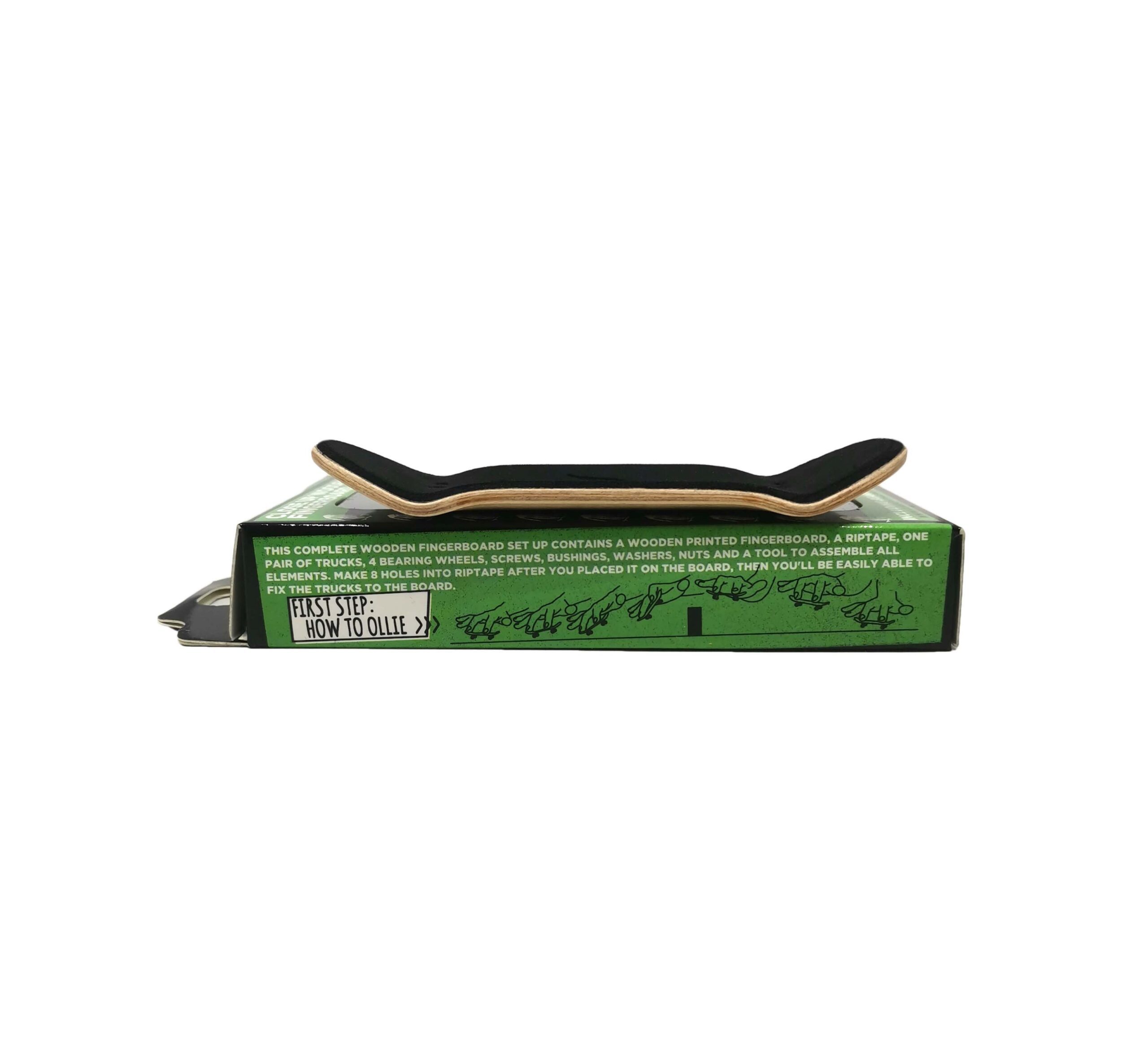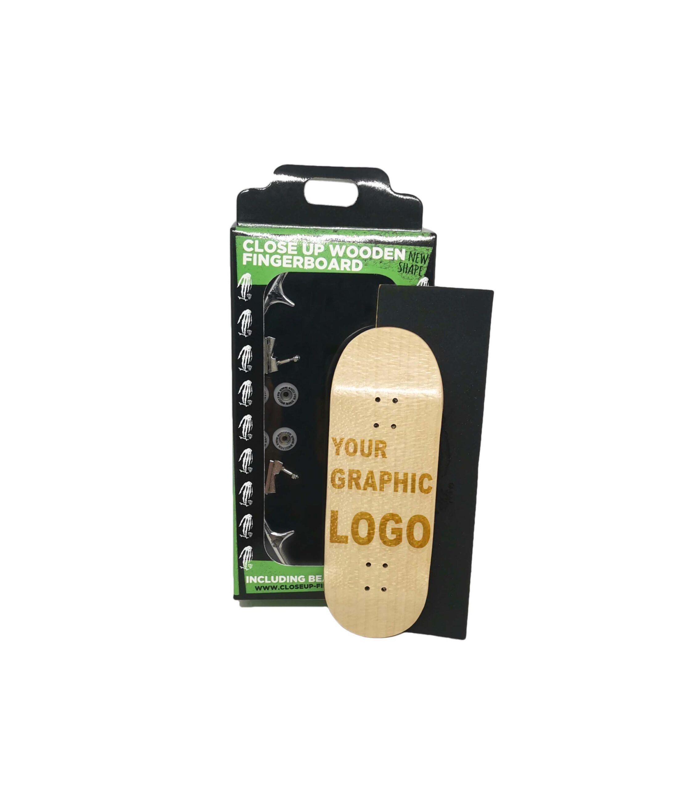 This complete set up includes all the parts necessary to assemble your own Fingerboard, with your customised fb deck Close Up, engraved by ladser with your own graphic or logo (you have to send us). Also included some 34mm printed fb trucks, 4 white bearing wheels, silicon small and large bushings, metal washers, screws, lockings nuts, fb took and a rectangle riptape to position and cut as on a real skateboard deck. Delivered witrh Close Up FB stickers.
